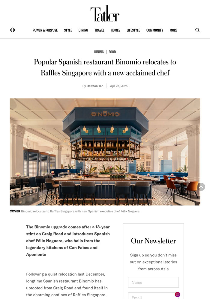 Tatler Asia: Popular Spanish restaurant Binomio relocates to Raffles Singapore with a new acclaimed chef