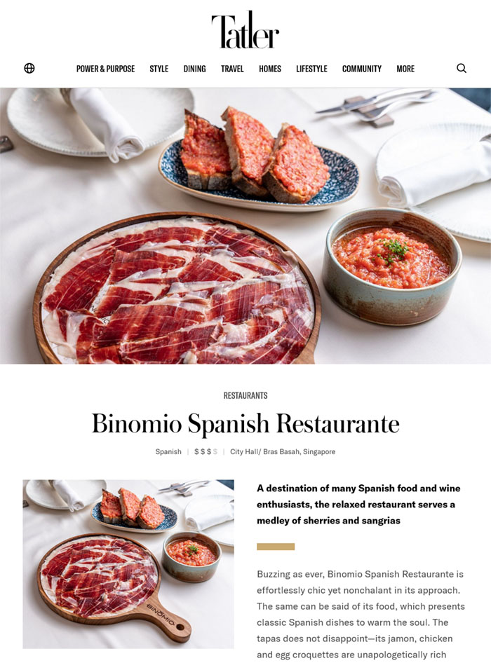 Tatler Asia: Binomio Spanish Restaurante30 May 2025 • PressBuzzing as ever, Binomio Spanish Restaurante is effortlessly chic yet nonchalant in its approach. The same can be said of its food, which presents classic Spanish dishes to warm the soul. Tatler Asia « middleclass.sg: Binomio Has A New Home At Raffles Singapore, Your New Spot For Spanish Cuisine in SingaporeSGMYFoodie.com: Binomio Menu Singapore Prices & Review Updated 2025 »